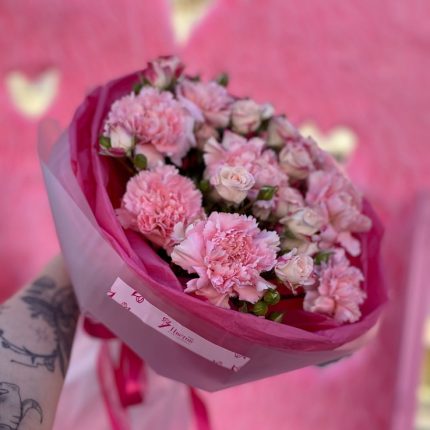 Состав: Роза одноголовая, хризантема ньютон, альстомерия, гвоздика шабо, эустома, упаковка. Состав и расцветка могут незначительно отличаться в зависимости от наличия и сезона.