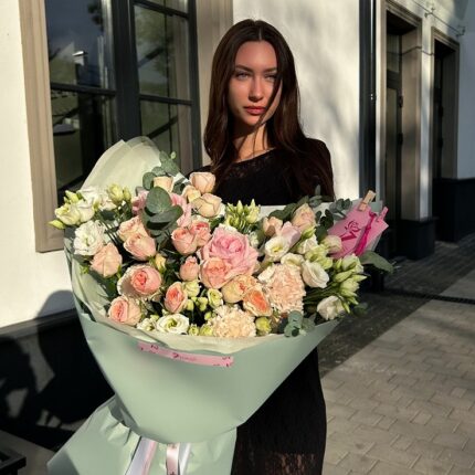 Состав: Роза одноголовая, роза кустовая, эустома, диантус, эвкалипт, упаковка. Состав и расцветка могут незначительно отличаться в зависимости от наличия и сезона.