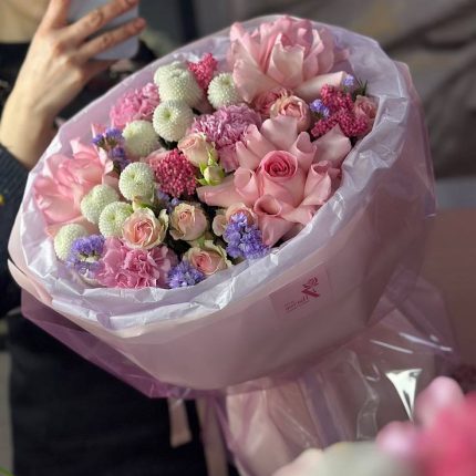 Состав: Роза одноголовая, эустома, диантус, роза кустовая Саммер роуз, стифа, упаковка. Состав и расцветка могут незначительно отличаться в зависимости от наличия и сезона.