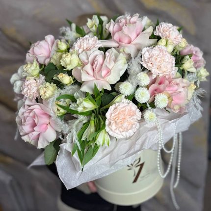 Состав: Роза одноголовая, эустома, диантус, роза кустовая Саммер роуз, стифа, упаковка. Состав и расцветка могут незначительно отличаться в зависимости от наличия и сезона.