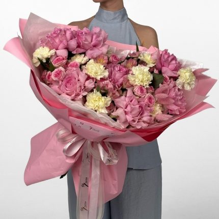 Состав: Роза одноголовая, эустома, диантус, роза кустовая Саммер роуз, стифа, упаковка. Состав и расцветка могут незначительно отличаться в зависимости от наличия и сезона.