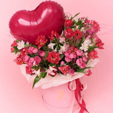 Цилиндр Нежное сердце с шаром-сердцем (тюльпан, альстромерия, кустовая роза, шар)