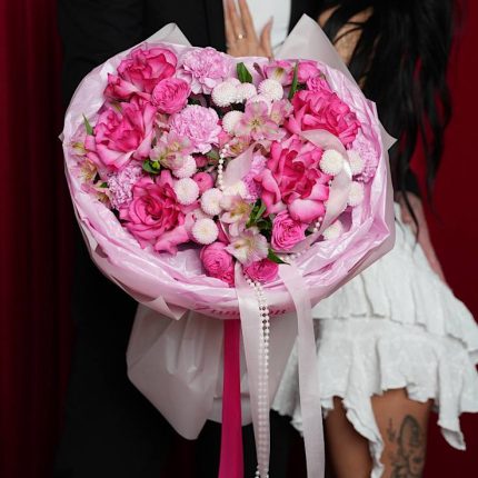 День Влюбленных Букет №22 с бусами (роза французская, кустовая пионовидая роза, хризантема кустовая, альстромерия, диантус) 184,00 Бел. руб