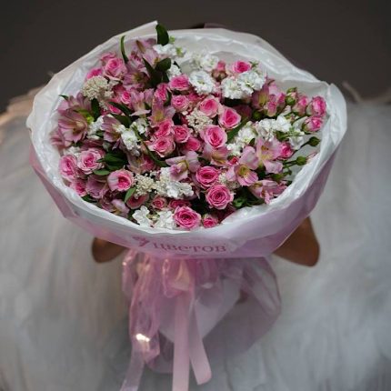 Букет Цвет настроения Розовый (Роза кустовая Рефлекс, эустома, альстромерия, диантус)