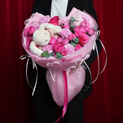 Состав: французская роза, диантус, озотамнус стабилизированный, пампасная трава, мягкая игрушка медвежонок с красным сердцем, цилиндр, оазис.