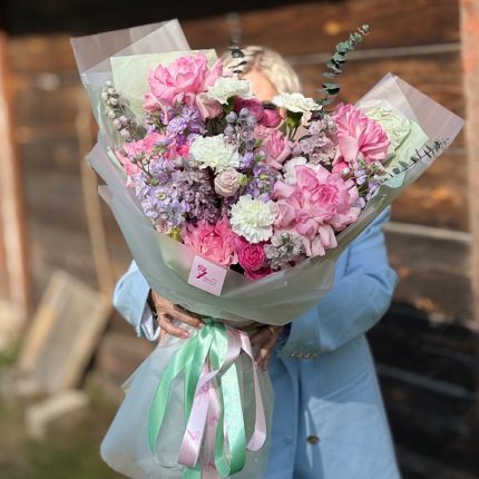 Букет Розово-лавандовый (роза одноголовая, дельфиниум, роза кустовая жизель, диантус, эвкалипт) 261,50 Бел. руб